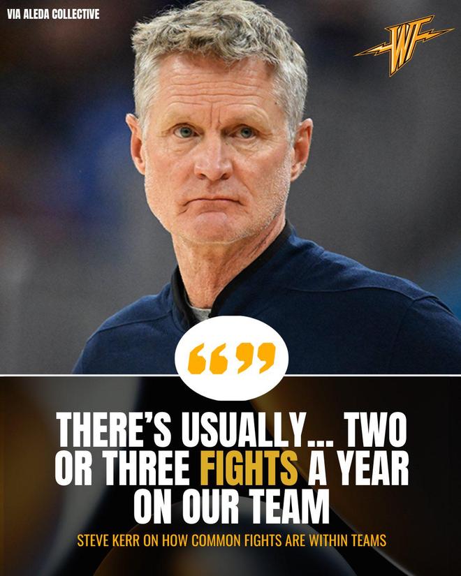 雷速体育9月18日讯 勇士主教练史蒂夫·科尔近期在参加播客节目《Aleda Collective》时,提到了NBA队内打架的情况。科尔表示:“这种情况很常见,一般来说我们队每年都会打上两三